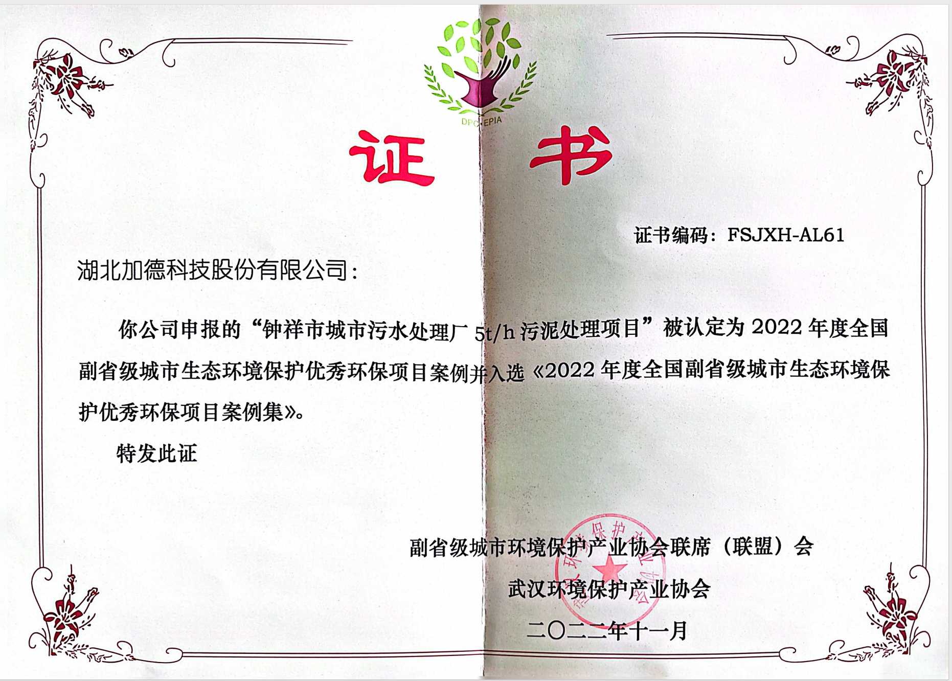 “鐘祥市城市污水處理廠 5t/h 污泥處理項(xiàng)目”認(rèn)證證書