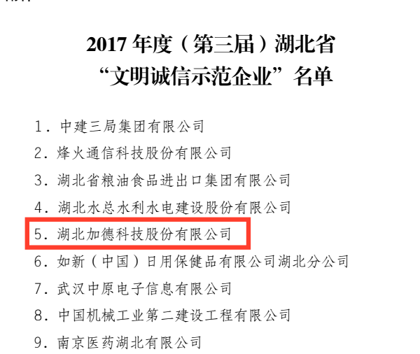 由中共湖北省委宣傳部、省文明辦、省工商局聯(lián)合開展的第三屆( 2017年度)湖北省 “文明誠信示范企業(yè)”創(chuàng)建活動(dòng)中,我公司獲得第三屆(2017年度)湖北省 “文明誠信示范企業(yè)”榮譽(yù)稱號(hào)。 我司會(huì)再接再厲,以黨的十九大精神為指引,繼續(xù)積極踐行社會(huì)主義核心價(jià)值觀,在推進(jìn)企業(yè)信用體系建...MORE →