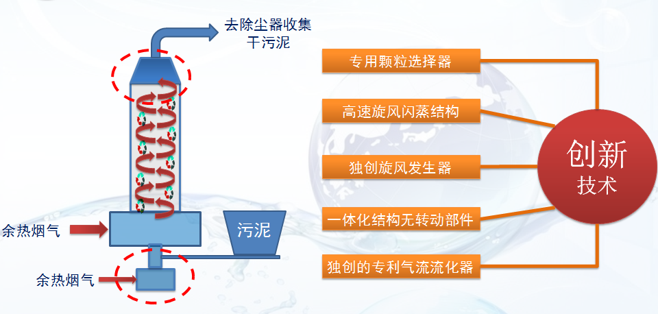 采用工業(yè)鍋爐、電廠和垃圾電廠余熱煙氣廢熱,干燥溫度140℃-170℃,干燥能源為余熱、廢熱,熱效率大于90%,3-6秒完成污泥干燥,運(yùn)轉(zhuǎn)風(fēng)機(jī)綜合能耗小于45kWh/噸污泥(含水率80%),因此,能耗極低。