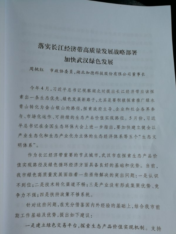 湖北加德科技股份有限公司董事長周桃紅作為武漢市政協(xié)代表應(yīng)邀參加此次座談會,并作了題為《落實長江經(jīng)濟高質(zhì)量發(fā)展戰(zhàn)略部署,加快武漢綠色發(fā)展》的大會口頭發(fā)言。周桃紅董事長結(jié)合自己多年從業(yè)經(jīng)驗和深入調(diào)研結(jié)果,指出:武漢作為長江經(jīng)濟帶重要的節(jié)點城市,在探索生態(tài)產(chǎn)品價值實現(xiàn)路徑及綠色循環(huán)經(jīng)濟方面具備良好的基礎(chǔ)和優(yōu)勢。同時,周桃紅董事長也深入剖析了當(dāng)前武漢綠色高質(zhì)量發(fā)展面臨的一些亟待解決的突出問題:一是認(rèn)識不到位;二是技術(shù)轉(zhuǎn)化渠道不暢;三是產(chǎn)業(yè)沒有形成集聚優(yōu)勢、競爭力不強;四是扶持政策不夠系統(tǒng)。針對這些問題,周桃紅董事長在深入調(diào)研思考,并充分借鑒國內(nèi)外經(jīng)驗的基礎(chǔ)上,提出四點建議:一是建立綠色交易平臺,探索生態(tài)產(chǎn)品價值實現(xiàn)機制;二是建設(shè)長江國際低碳產(chǎn)業(yè)園,以點帶面發(fā)展綠色產(chǎn)業(yè);三是實施武漢生態(tài)工業(yè)園區(qū)工程,促進環(huán)保產(chǎn)業(yè)化;四是設(shè)立“兩山綠色發(fā)展基金”,為產(chǎn)業(yè)落地提供金融支撐。