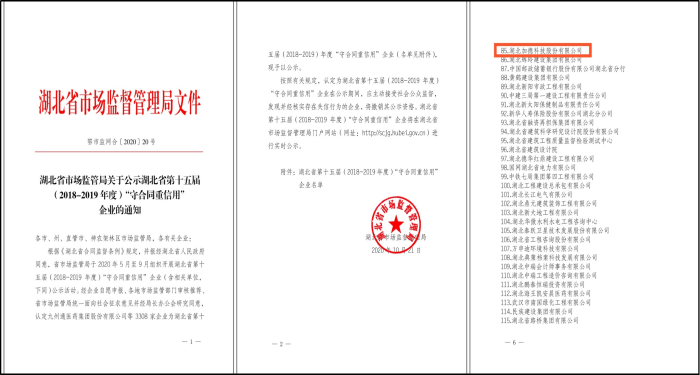 近日,我公司被湖北省市場(chǎng)監(jiān)督管理局授予湖北省第十五屆“守合同重信用”企業(yè)榮譽(yù)稱號(hào),此次是公司繼第十三屆和第十四屆連續(xù)兩屆入選湖北省“守合同重信用”企業(yè)之后,憑借多年來的積累與信譽(yù),再度榮獲省級(jí)“守合同重信用”企業(yè)殊榮。