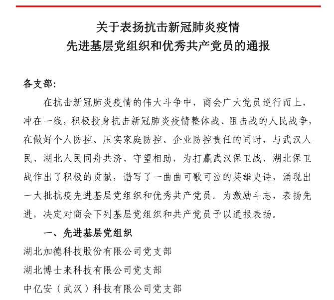 自新冠肺炎防控工作開展以來,我司積極投身抗擊新冠肺炎疫情的工作中,在督促企業(yè)員工及家屬做好個人防控的同時,與武漢人民、湖北人民同舟共濟(jì)、守望相助,為打贏武漢保衛(wèi)戰(zhàn)、湖北保衛(wèi)戰(zhàn)做出了積極貢獻(xiàn)?,F(xiàn)為表彰我司在疫情防控工作中做出的貢獻(xiàn),湖北省環(huán)境產(chǎn)業(yè)保護(hù)協(xié)會授予我司“抗疫工作優(yōu)秀單位”稱號,湖北省安徽商會授予我司“先進(jìn)基層黨組織”稱號。