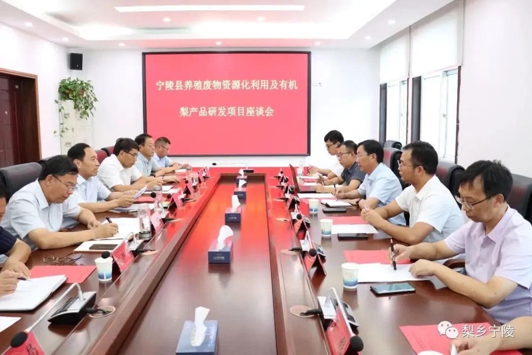 蔡勇在致辭中對(duì)周桃紅及項(xiàng)目研發(fā)團(tuán)隊(duì)成員一行到寧陵進(jìn)行考察研討表示歡迎,并簡(jiǎn)要介紹了寧陵縣情及農(nóng)業(yè)、畜牧業(yè)發(fā)展情況。蔡勇指出,寧陵畜牧業(yè)發(fā)展迅速,全縣現(xiàn)有出欄萬(wàn)頭以上生豬養(yǎng)殖場(chǎng)28個(gè)、生豬養(yǎng)殖規(guī)模150萬(wàn)頭,連續(xù)4年被評(píng)為“生豬調(diào)出大縣”,被認(rèn)定為河南省畜牧業(yè)高質(zhì)量發(fā)展示范縣,特別是已建成投產(chǎn)的牧原400萬(wàn)頭生豬屠宰項(xiàng)目成為全國(guó)規(guī)模最大的現(xiàn)代化屠宰基地,形成了肉羊、肉鴿、肉雞、肉驢等一批規(guī)模較大的特色養(yǎng)殖企業(yè),打造了一批高質(zhì)量高品牌高效益養(yǎng)殖企業(yè)。同時(shí),寧陵擁有22萬(wàn)畝金頂謝花酥梨,種植面積位于全國(guó)前三,是中國(guó)農(nóng)科院重點(diǎn)支持的種植基地。蔡勇指出,加快推進(jìn)畜禽養(yǎng)殖廢棄物資源化利用是踐行綠色發(fā)展理念的重要舉措,更是我縣作為農(nóng)業(yè)大縣、推進(jìn)畜禽養(yǎng)殖業(yè)轉(zhuǎn)型升級(jí)的必然要求。寧陵縣正在通過(guò)養(yǎng)殖、種植產(chǎn)業(yè)的迭代升級(jí),實(shí)現(xiàn)由傳統(tǒng)的養(yǎng)殖業(yè)向現(xiàn)代化的養(yǎng)殖業(yè),由無(wú)公害農(nóng)業(yè)向綠色農(nóng)業(yè)和生態(tài)農(nóng)業(yè)的發(fā)展,希望湖北加德科技有限公司及項(xiàng)目研發(fā)團(tuán)隊(duì)能圍繞本次座談主題出謀劃策、分享智慧、做好輔導(dǎo),寧陵將認(rèn)真吸納各位專家的真知灼見,虛心求教,期待雙方在養(yǎng)殖廢物資源化利用及有機(jī)梨產(chǎn)品研發(fā)項(xiàng)目領(lǐng)域開展合作,為寧陵畜牧產(chǎn)業(yè)高質(zhì)量發(fā)展以及環(huán)境保護(hù)工作做出貢獻(xiàn)。