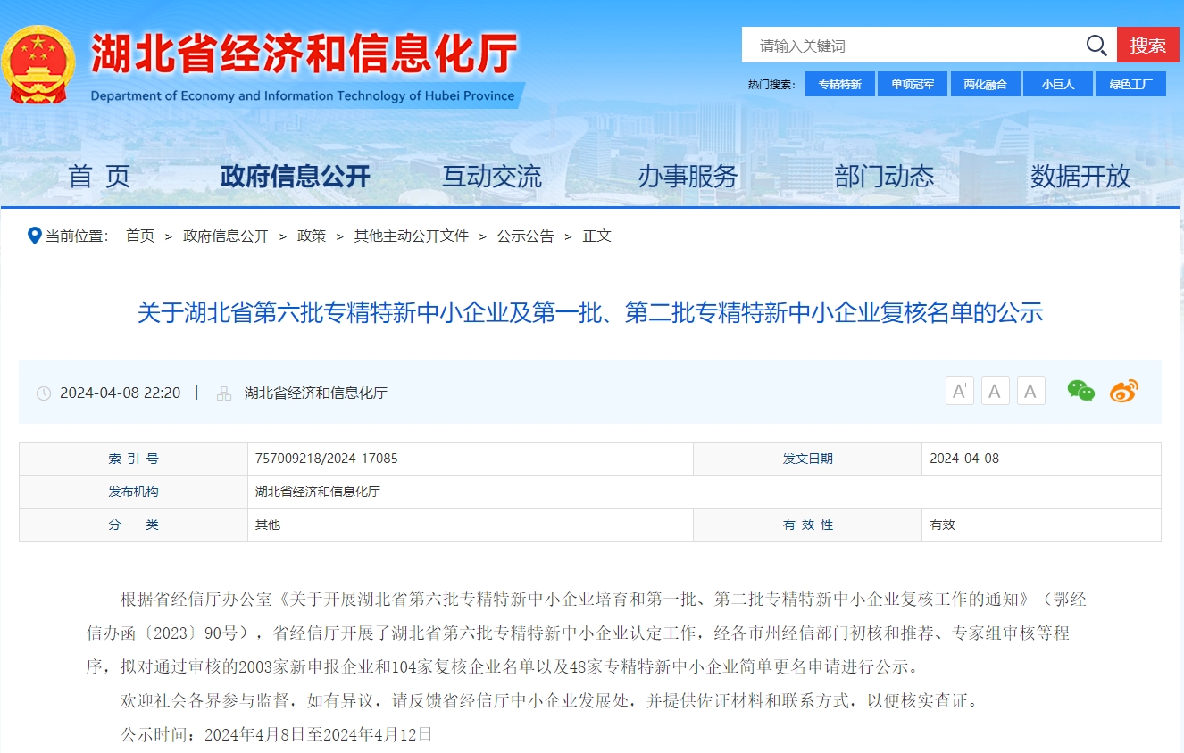 2024年4月8日,湖北省經濟和信息化廳公布了第六批省專精特新中小企業(yè)名單,湖北加德科技股份有限公司憑借顯著的創(chuàng)新能力成功入選。此次加德科技被認定為湖北省專精特新中小企業(yè),是對加德科技的科研創(chuàng)新實力、技術專業(yè)化精細化等方面綜合實力的高度肯定。